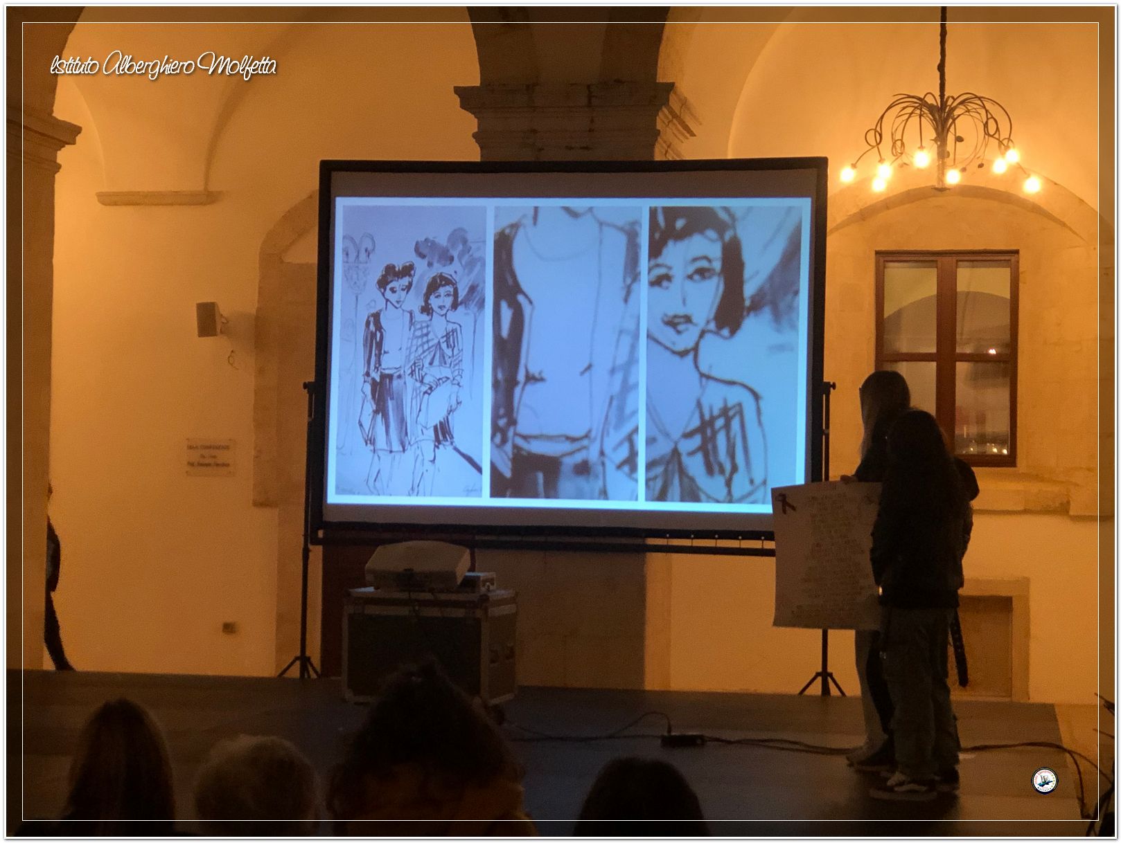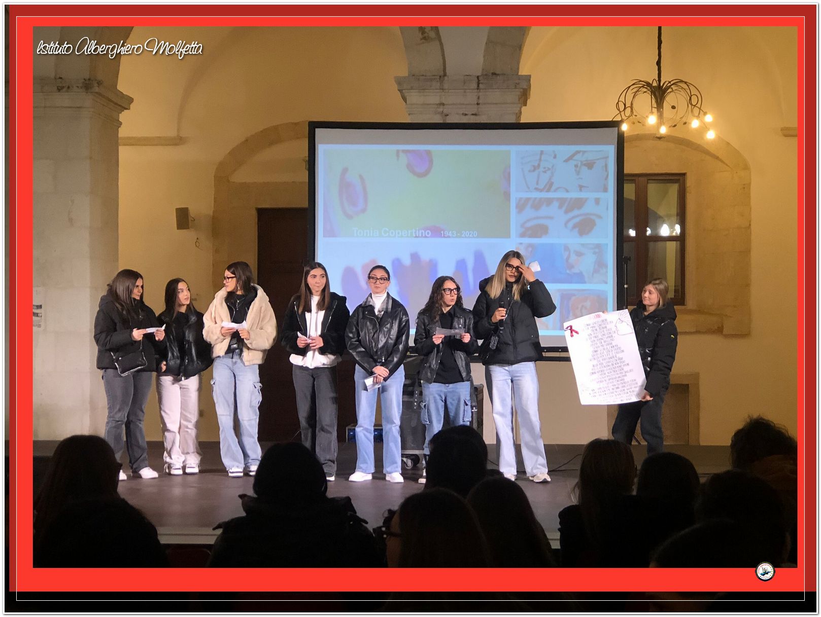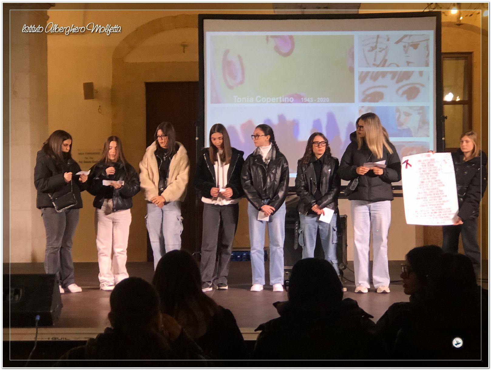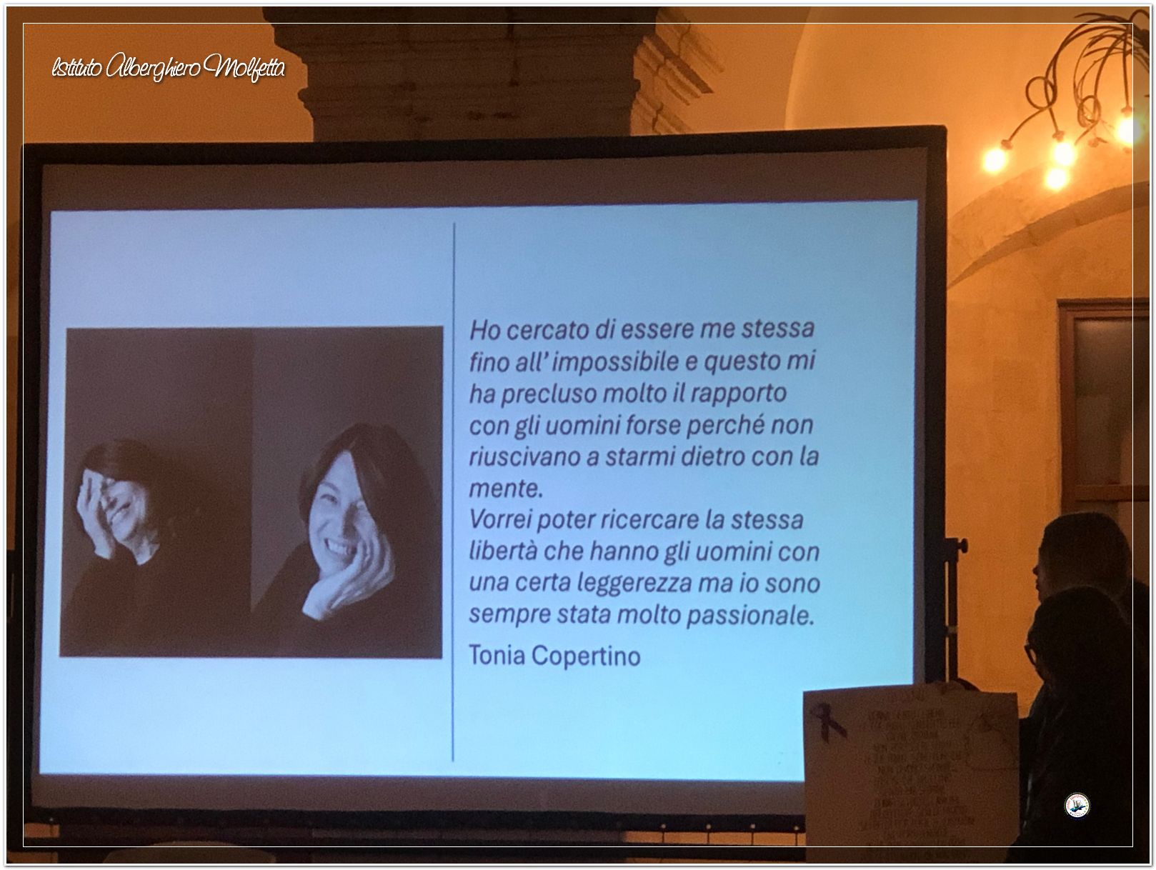 Tema della serata, era presentare una donna molfettese che si è distinta in ambito sociale, culturale, artistico, ecc. Il nostro istituto ha scelto l’artista, prof.ssa Tonia Copertino, una figura emblematica nel panorama artistico molfettese. La produzione si è articolata in tre parti: una lettura di testimonianze rilasciate da critici ed estimatori, uno slideshow di alcune tra le più significative opere dell’artista e infine è stata ascoltata la voce dell’artista in un estratto audio di un intervista rilasciata nel 2007.