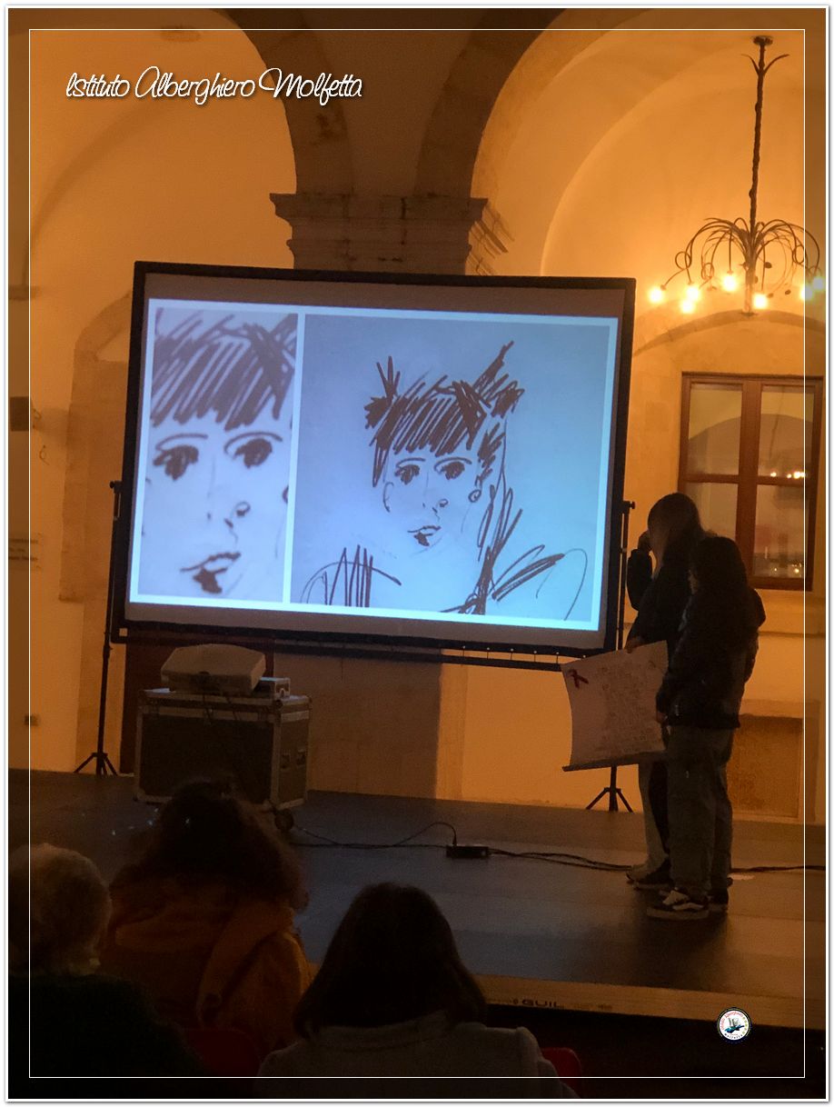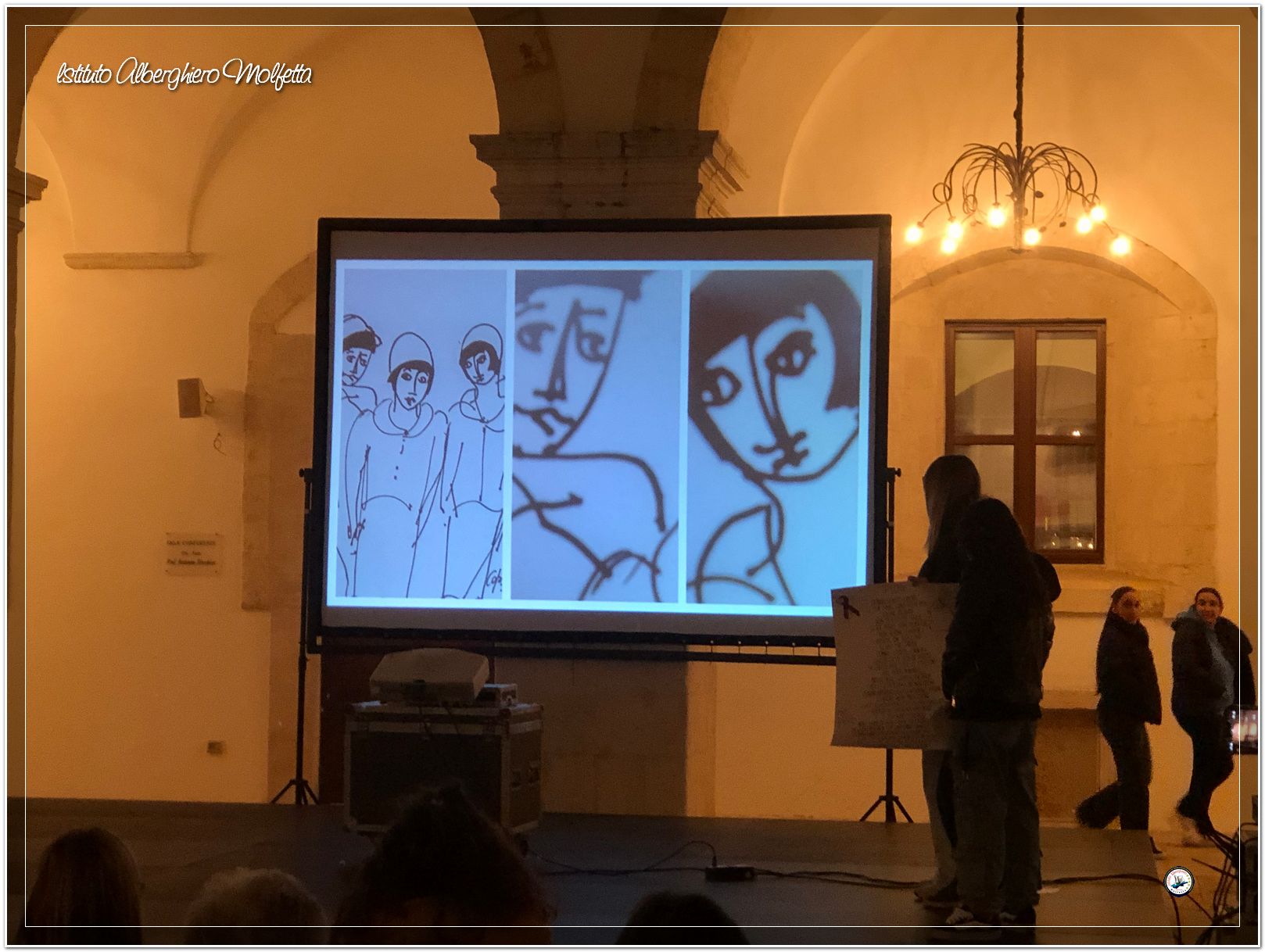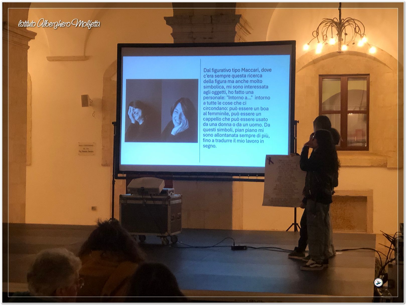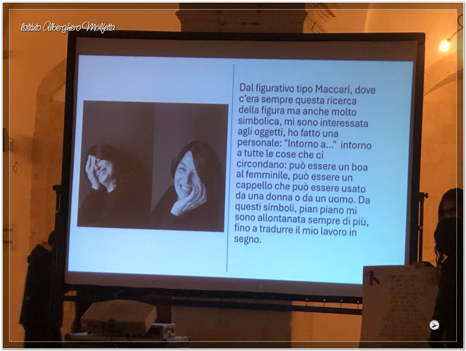 Tema della serata, era presentare una donna molfettese che si è distinta in ambito sociale, culturale, artistico, ecc. Il nostro istituto ha scelto l’artista, prof.ssa Tonia Copertino, una figura emblematica nel panorama artistico molfettese. La produzione si è articolata in tre parti: una lettura di testimonianze rilasciate da critici ed estimatori, uno slideshow di alcune tra le più significative opere dell’artista e infine è stata ascoltata la voce dell’artista in un estratto audio di un intervista rilasciata nel 2007.