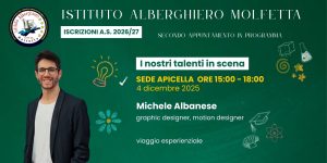 🎥Sarà presente Michele Albanese. ex studente della nostra scuola, con laurea triennale in Nuove Tecnologie dell’Arte e laurea specialistica in Graphic Design presso l’Accademia di Belle Arti di Foggia, che gestirà un laboratorio esperienziale con i ragazzi partecipanti.