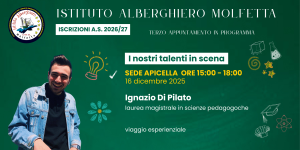 Sarà presente Ignazio Di Pilato, ex studente della nostra scuola, con laurea magistrale in scienze pedagogiche, che gestirà un laboratorio esperienziale con i ragazzi partecipanti.